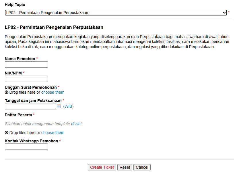 - Ajukan permohonan kelas Literasi Informasi melalui Sistem Ticketing Layanan Perpustakaan