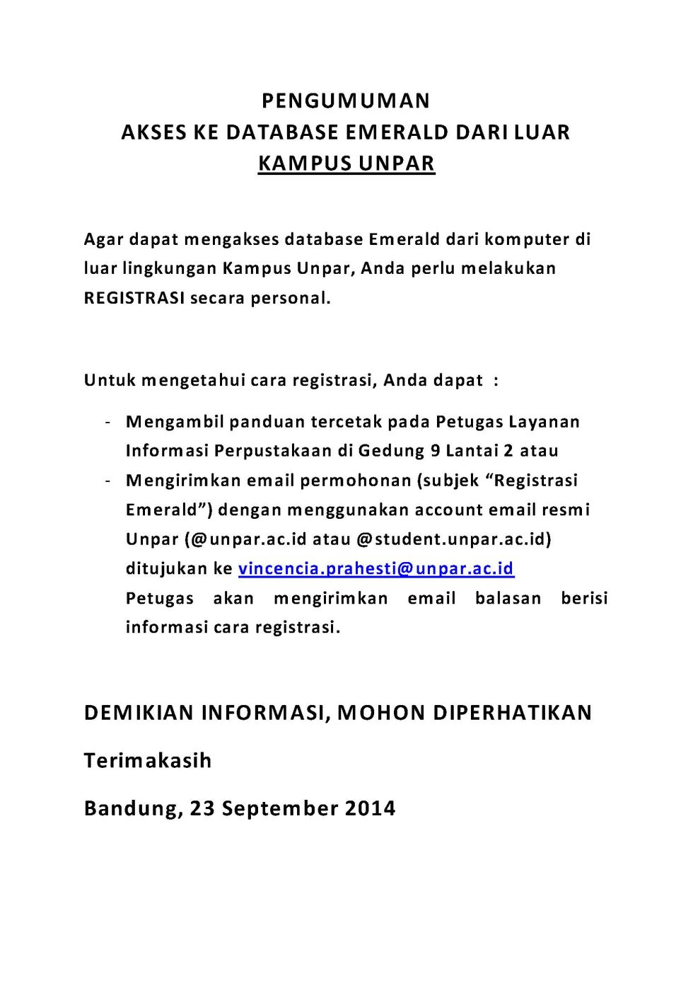 • PENGUMUMAN AKSES KE DATABASE EMERALD DARI LUAR KAMPUS UNPAR