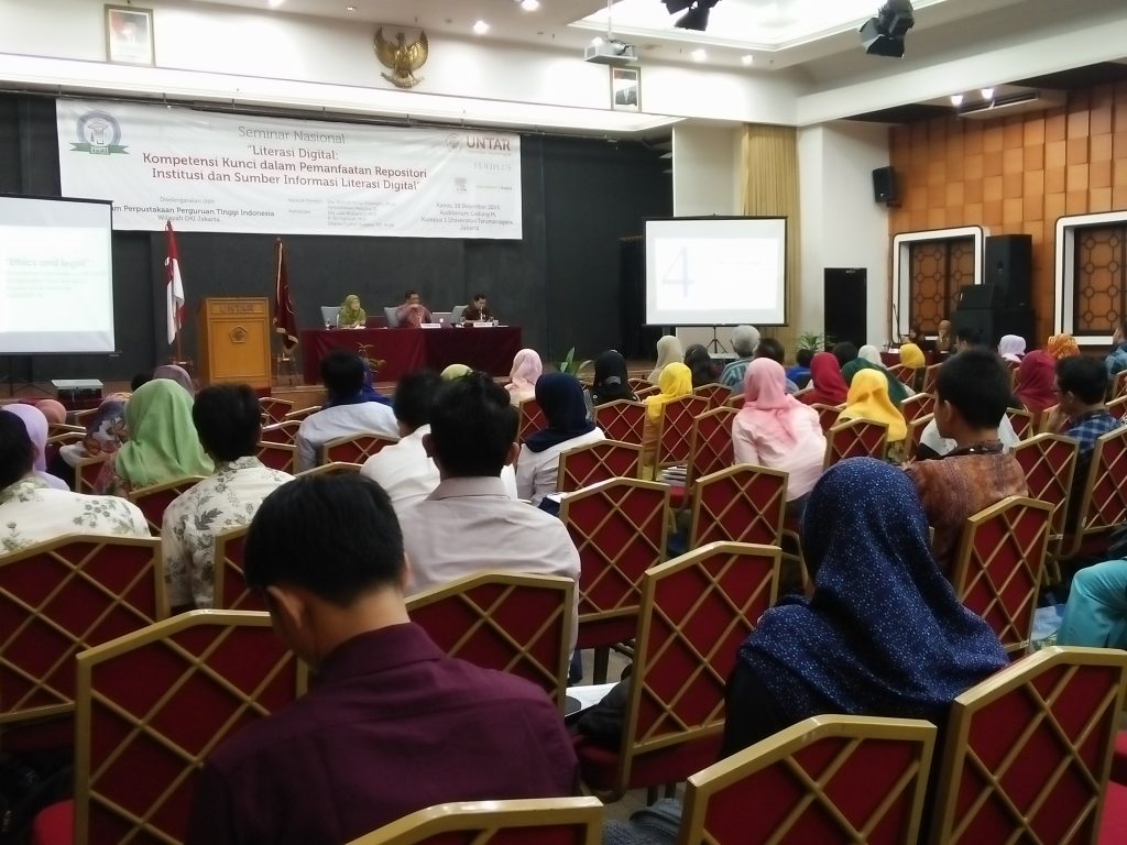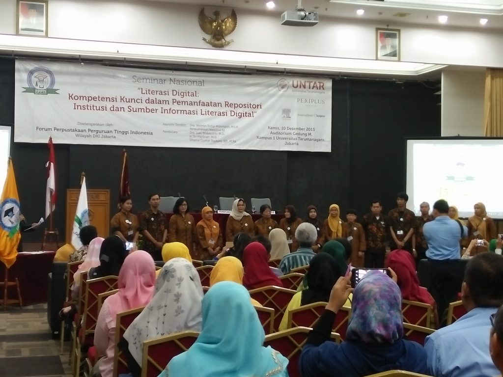 Forum Perpustakaan Perguruan Tinggi Indonesia (FPPTI) DKI Jakarta menyelenggarakan seminar nasional dengan tema “Literasi Digital : Kompetensi Kunci dalam Pemanfaatan Repositori Institusi dan Sumber Informasi Digital” yang dilaksanakan pada hari Kamis tanggal 10 Desember 2015. Peserta yang mengikuti seminar kurang lebih 200 orang.