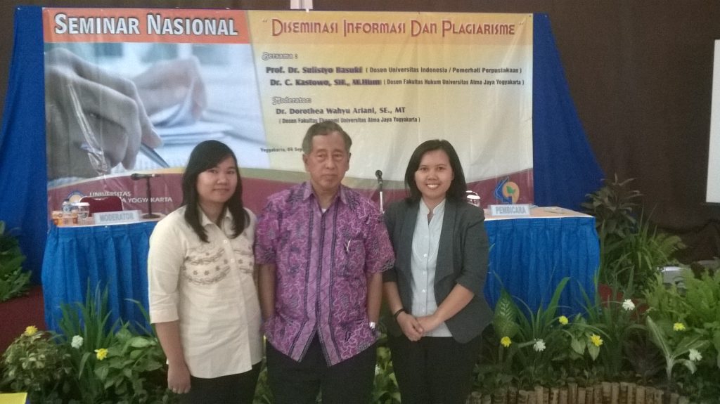 Kamis, 4 September 2014, perwakilan dari Perpustakaan Unpar mendapat kesempatan untuk mengikuti kegiatan seminar yang diadakan oleh Perpustakaan Universitas Atma Jaya Yogyakarta. Seminar tersebut bertajuk “Diseminasi Informasi dan Plagiarisme” yang dimoderatori oleh Dr. Dorothea Wahyu Ariani, SE., MT. (Dosen Fakultas Ekonomi Universitas Atma Jaya Yogyakarta). Sebagai narasumber yaitu Prof. Dr. Sulistyo Basuki (Dosen Universitas Indonesia / Pemerhati Perpustakaan) dan Dr. C. Kastowo, SH., M.Hum (Dosen Fakultas Hukum Universitas Atma Jaya Yogyakarta).